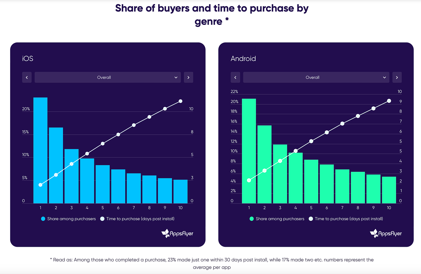 4. The first week is crucial for assessing a project's monetization potential. On iOS, 22.99% of all paying users within the first 10 days make a purchase on Day 1. On Android, this figure is 21.11%.
