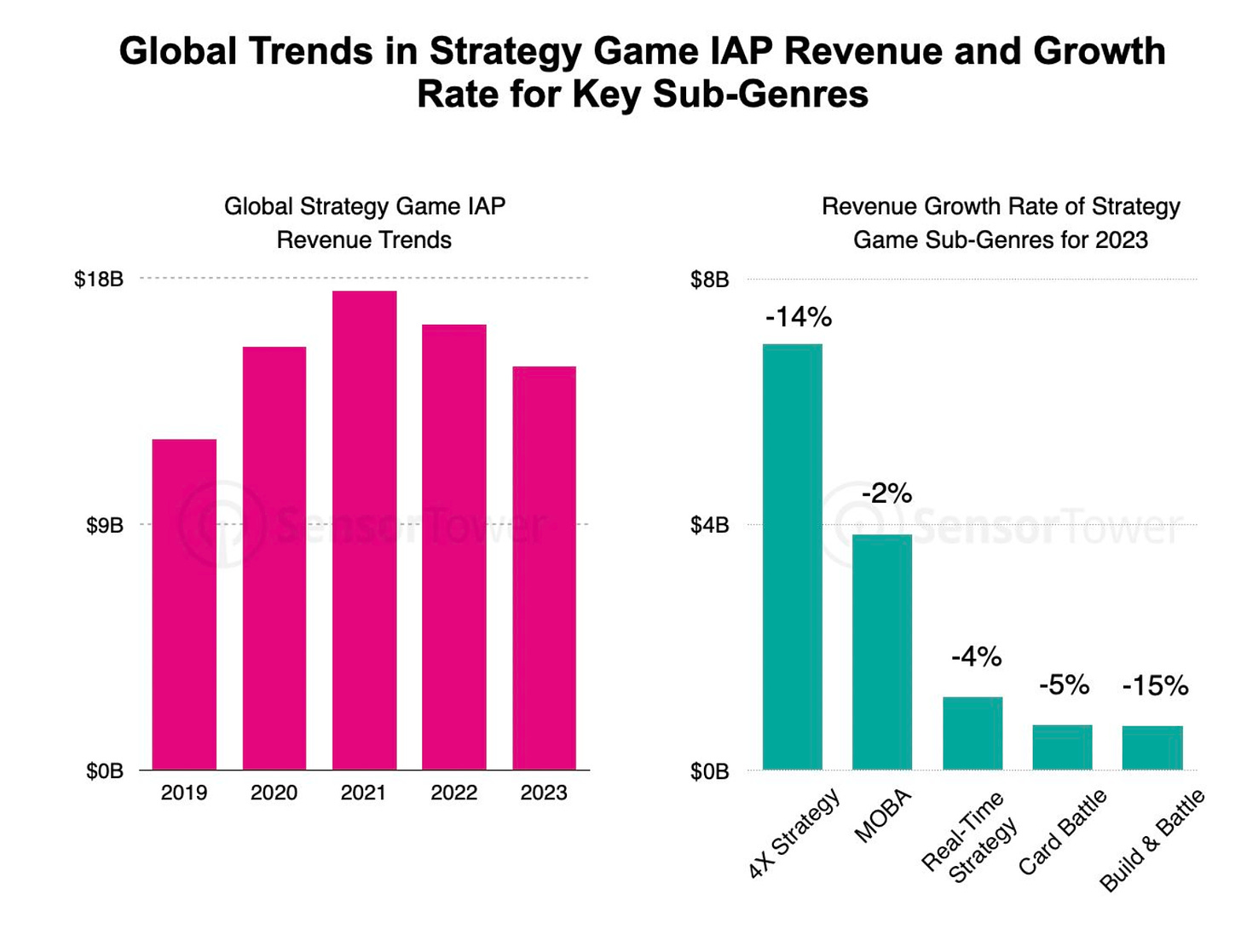 • A similar trend is seen in strategy games. The genre fell by 10% in 2023, to $14.8 billion. However, its revenue is still 22% higher than in 2019. 4X strategy games account for 47% of the genre's total revenue ($7 billion in 2023, but a 14% decline compared to 2022). MOBA games fell by 2%; real-time strategies by 4%; card battlers by 5%; and build & battle games by 15%.