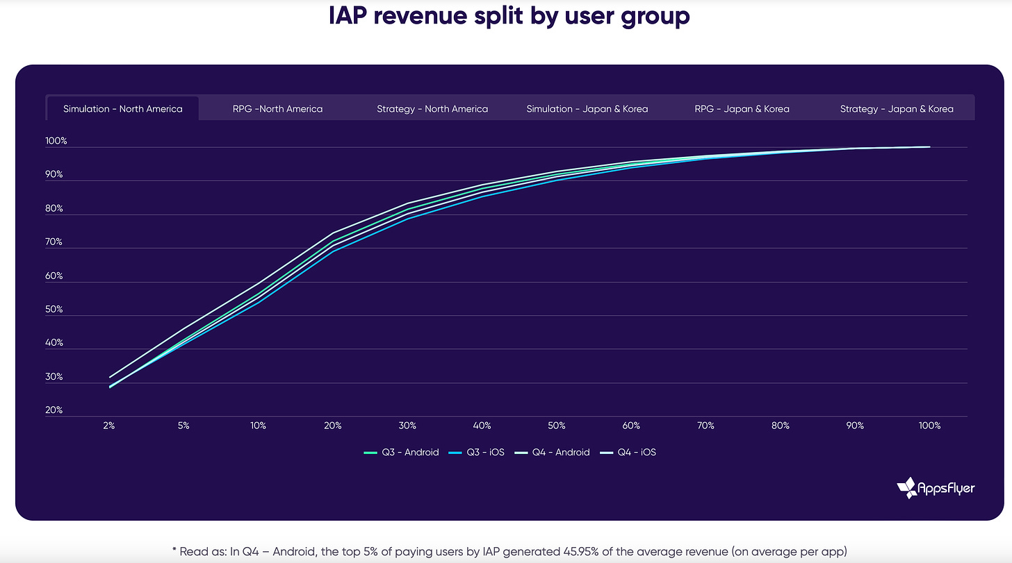 5. It's becoming harder to find "whales" on iOS. The share of revenue from top-paying users in North America dropped from 34% in Q1 2023 to 27% in Q1 2024. On Android, however, it slightly increased—from 34% to 35% over the same period. On both iOS and Android, the top 5% of paying users generate about 50% of total revenue.