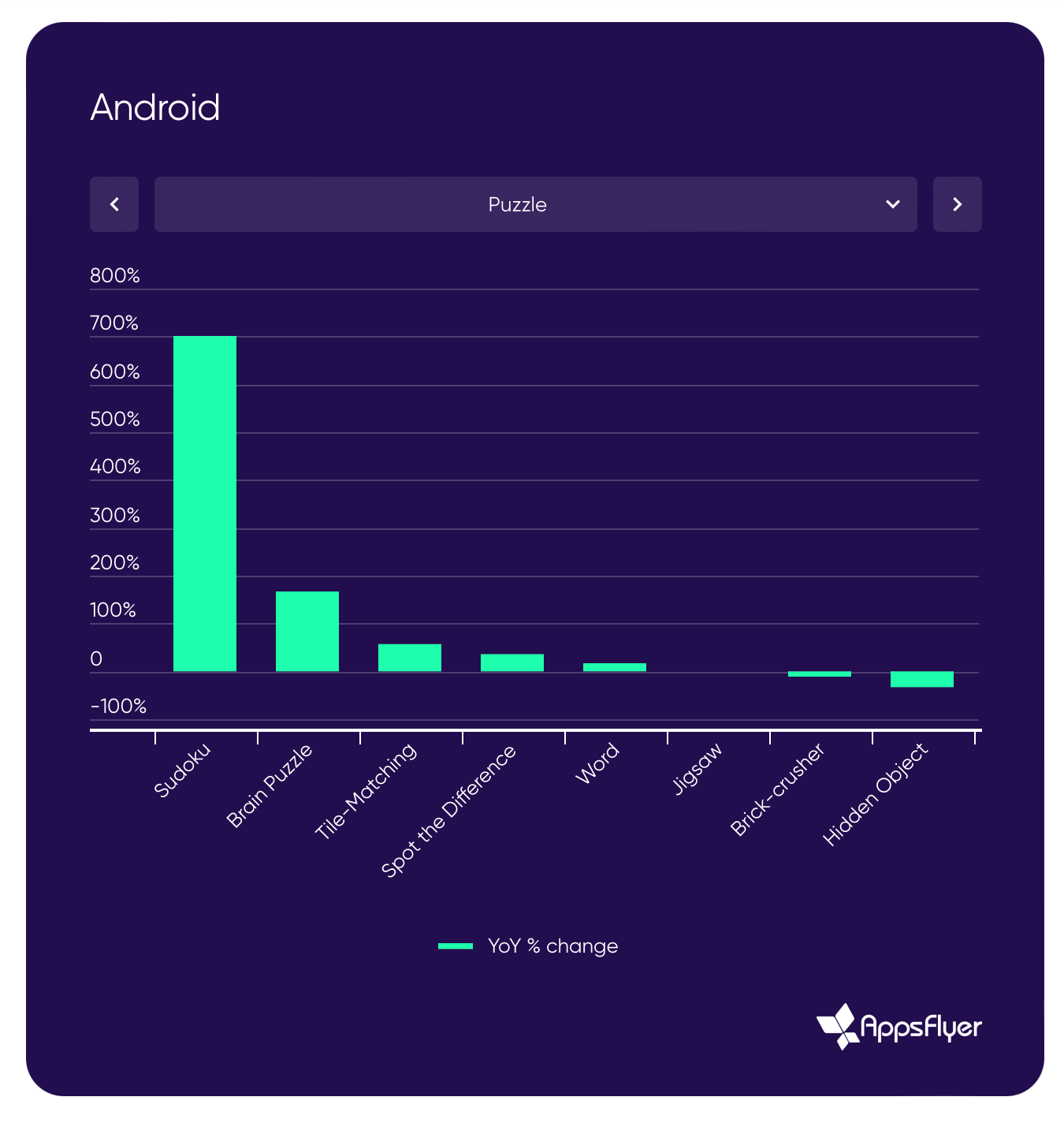 • On Android, puzzles showed the strongest growth in non-organic installs. Among subcategories, Sudoku saw the highest growth.