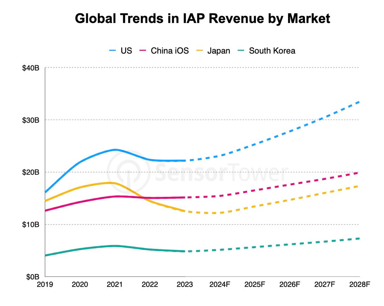• In 2023, IAP revenue in Japan fell to $12.5 billion (-13% YoY); in South Korea, it dropped by 7% to $4.8 billion.