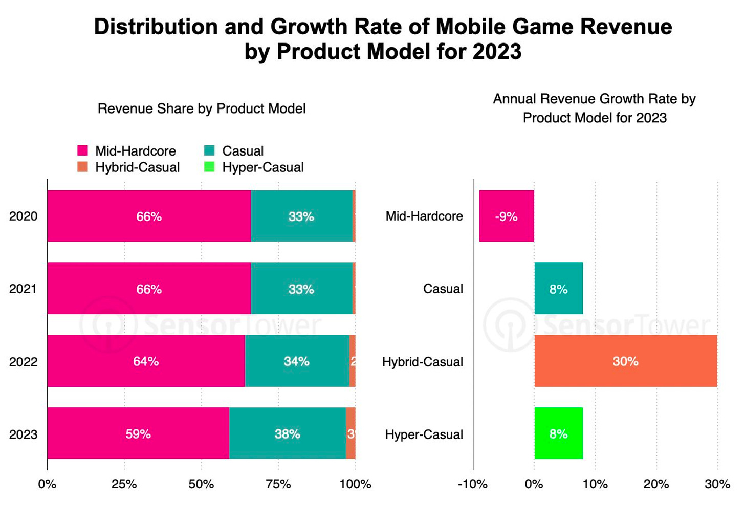 • The share of mid-core game revenue has been declining over the years. In 2020, they accounted for 66% of the market, but by 2023, this had fallen to 59%. Revenue decreased by 9% in 2023, while all other categories grew. Hyper-casual projects grew by 8%.