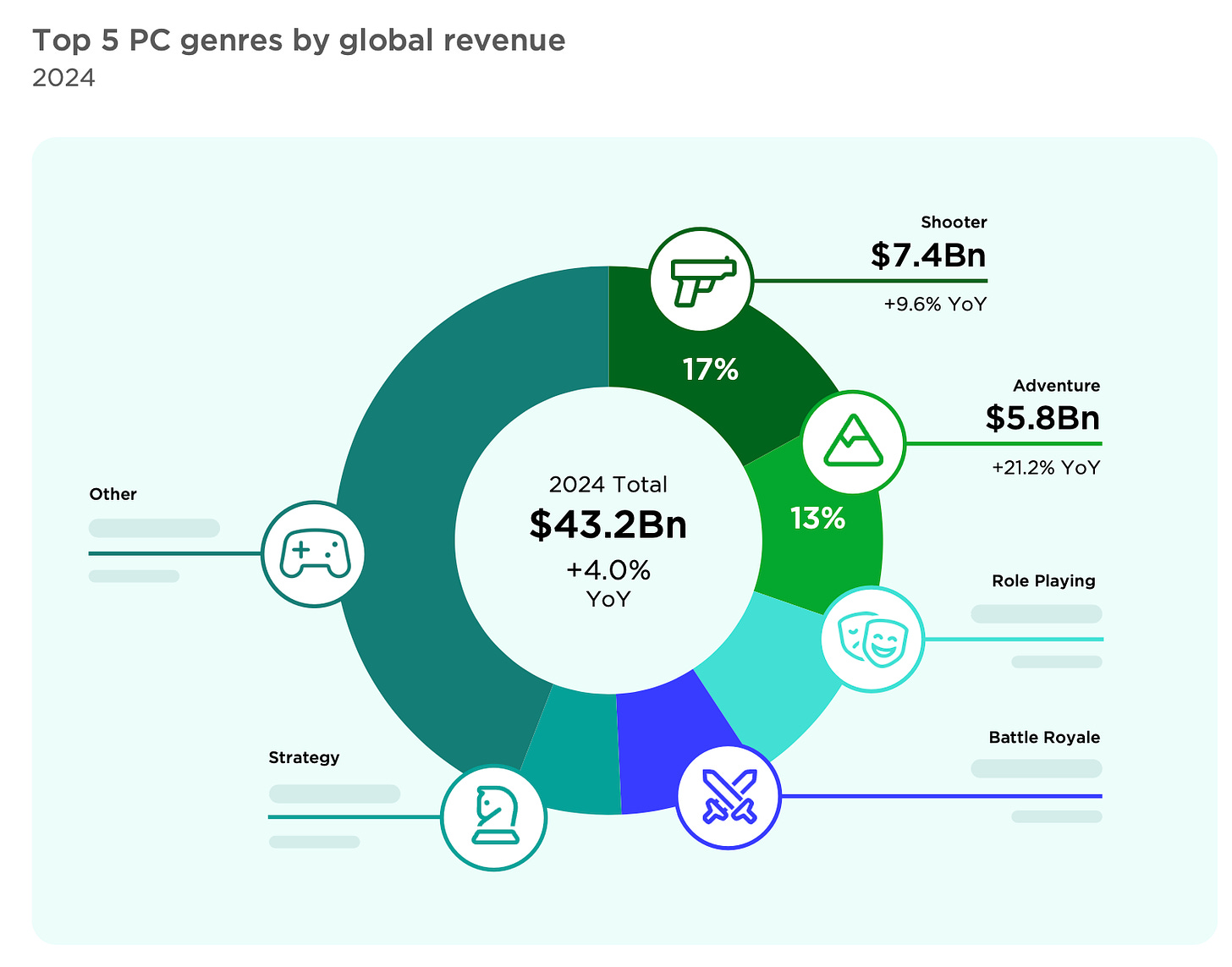 • Revenue from casual games grew by 8% in 2023, reaching $28.6 billion. This accounts for 38% of the total market volume.