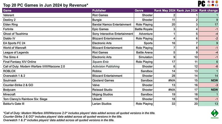 • On PC, the highest-earning game was Valorant. Soulmask (15th place) and Bodycam (17th place) entered the top 20 for the first time. Baldur's Gate III returned to the top-20.