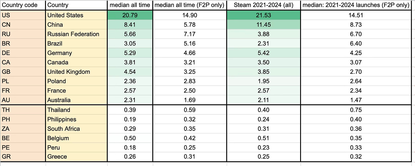 • However, if we are talking about F2P games, the situation changes dramatically. The median percentage of players in the USA for F2P projects is 14.9%; for Russia - 7.17%; for China - 5.78%; for Brazil - 5.16%. Overall, the share of players in free-to-play games is higher in developing countries.