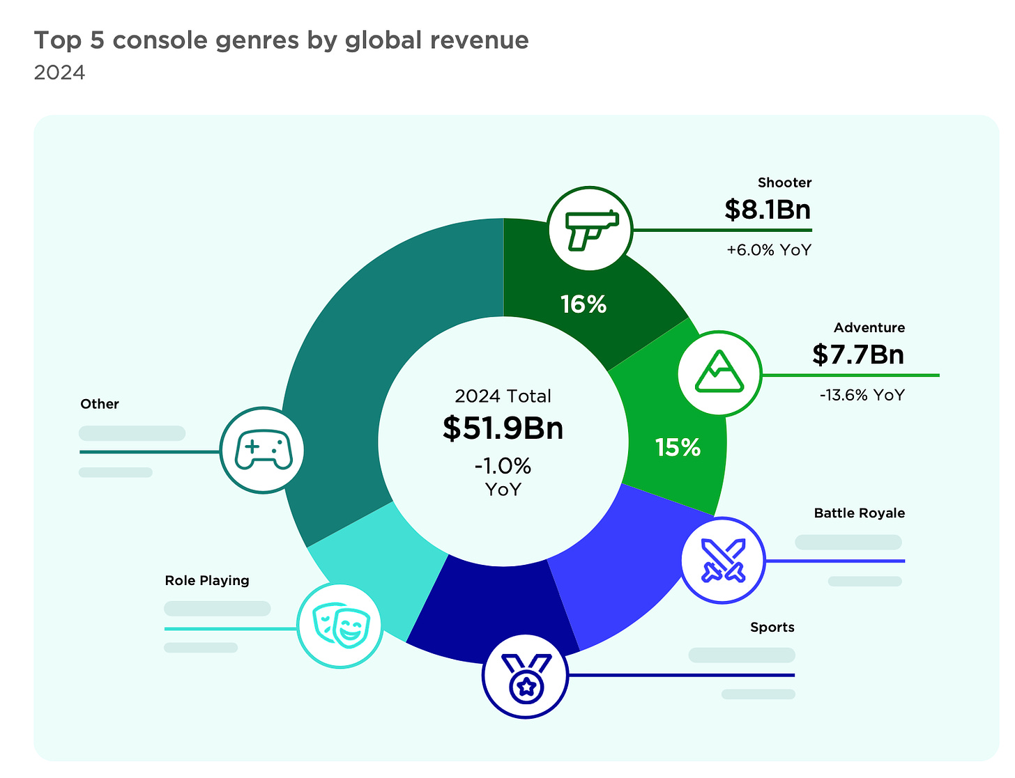 • The biggest declines were seen in shooters (-13% YoY); lifestyle projects (-11% YoY); RPGs (-10% YoY); and strategy games (-10% YoY).