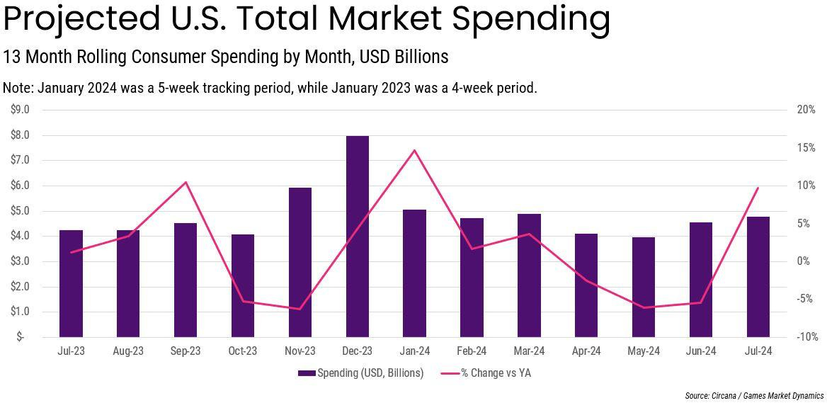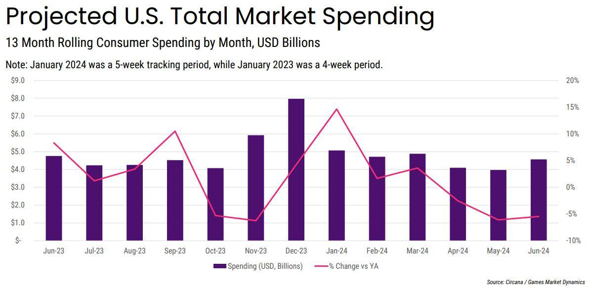 • The total revenue of the gaming market in June 2024 was $4.569 billion. This is 5% less than the previous year.