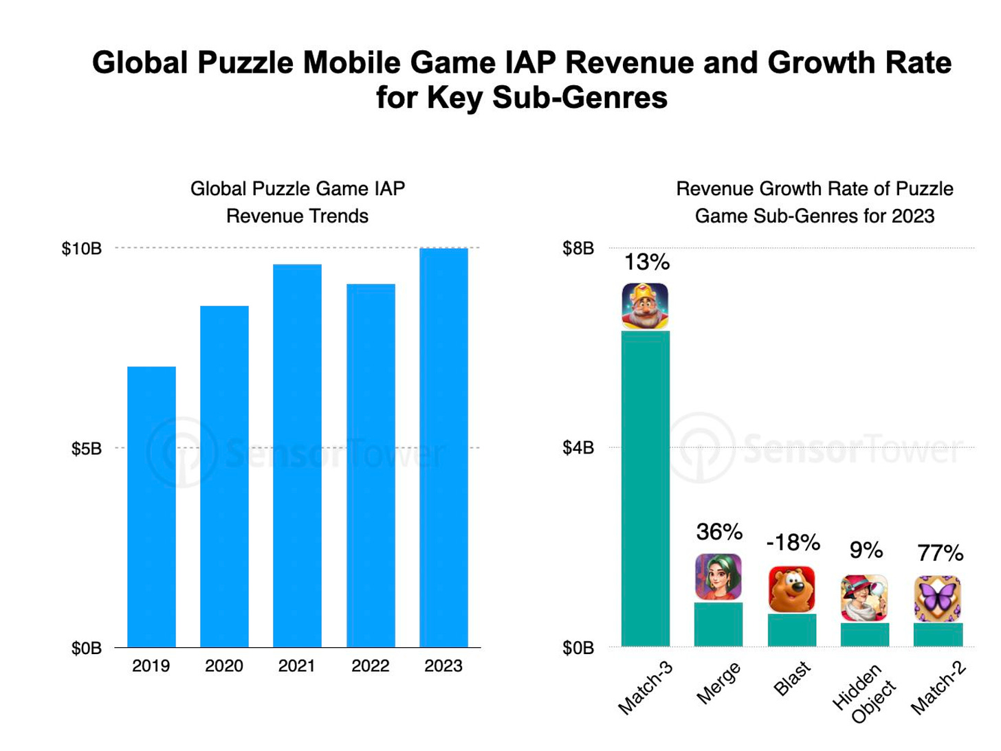 • In 2023, puzzles earned more than $10 billion from IAP purchases for the first time. The strongest growth was in Match-2 projects (+77% YoY); merge games (+36% YoY); Match-3 (+13% YoY); and hidden object games (+9% YoY). Only the blast games segment fell (-18% YoY).