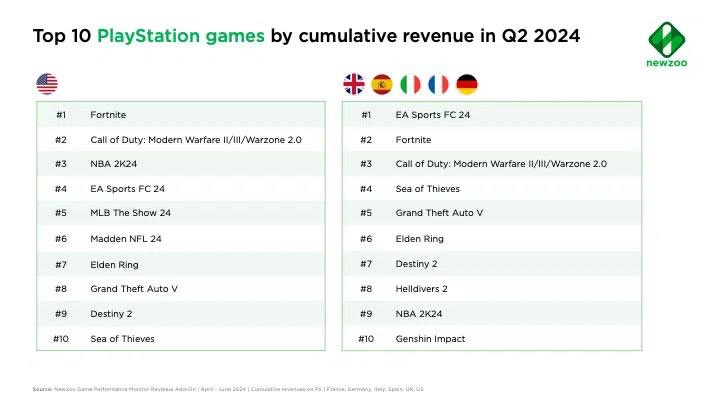 • PlayStation - In the USA, Fortnite, Call of Duty series games, and NBA 2K24 lead. In Europe, EA Sports FC 24 is at the top. Sports games on PS accounted for 21% of all gaming revenue in the USA. In Europe, football and basketball games accounted for 36.8% of all revenue.