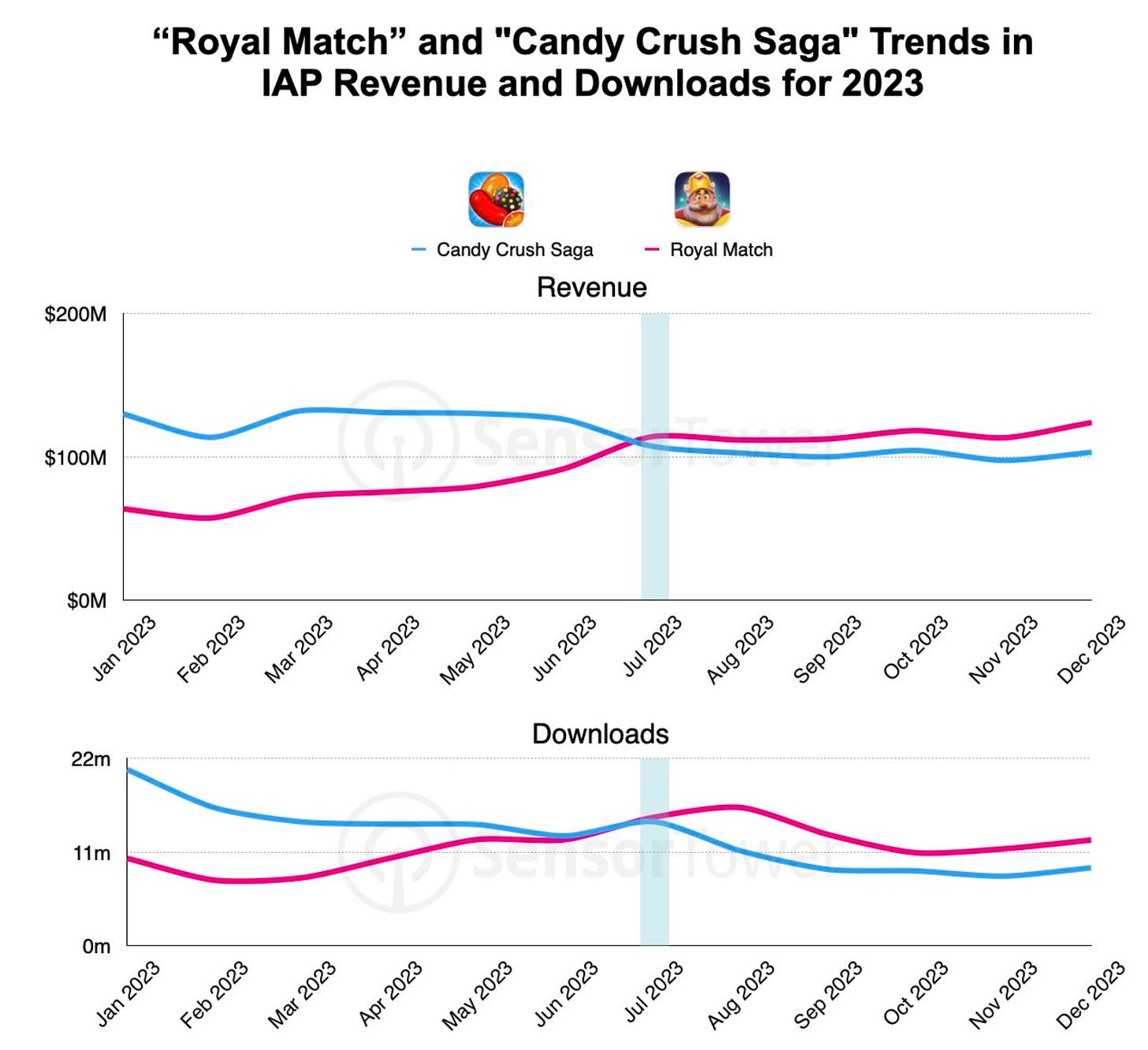 • Royal Match surpassed Candy Crush Saga in revenue for the first time in 2023. Since June-July 2023, the game has also been leading in downloads.