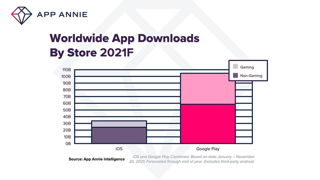 In Q3 2021 apps were downloaded 35.7B times. 27.6B belongs to Google Play.