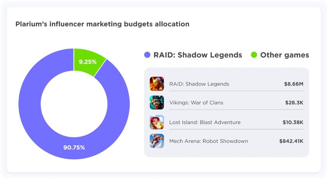 About 90.75% of the influencer budget Plarium has spent on RAID: Shadow Legends. Mech Arena: Robot Showdown got a modest $842k, while Vikings: War of Clans - only $28.3k in half a year.