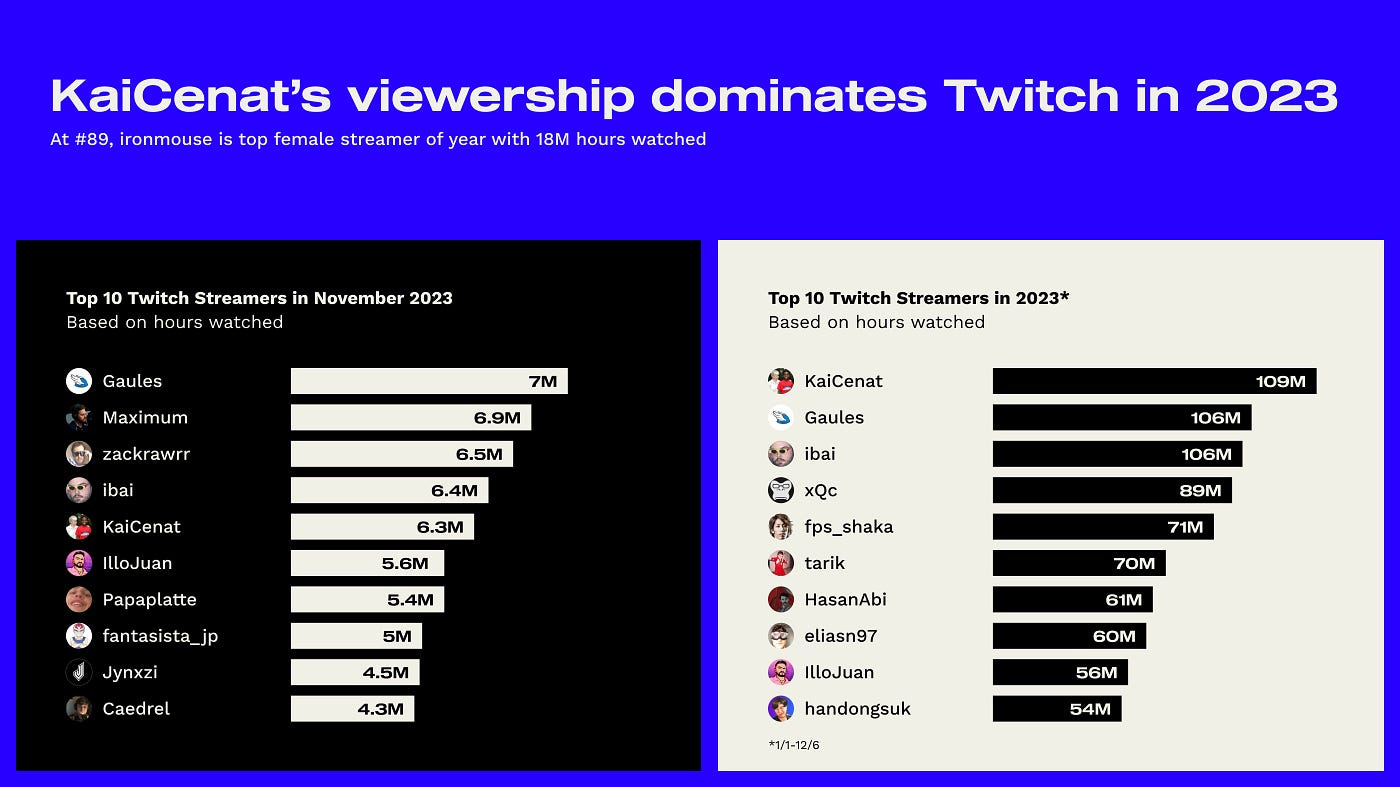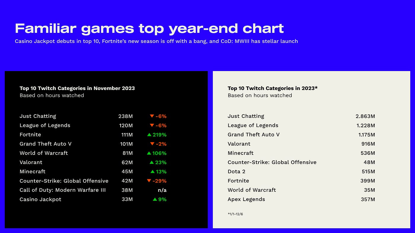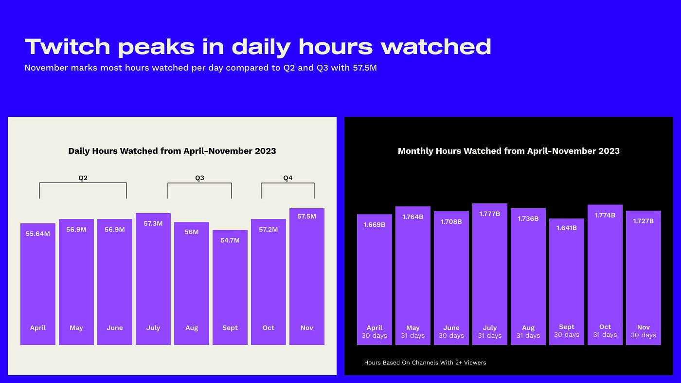 The total number of hours watched on Twitch in November declined compared to October (1.774 billion versus 1.727 billion), but this is due to one fewer day in November.