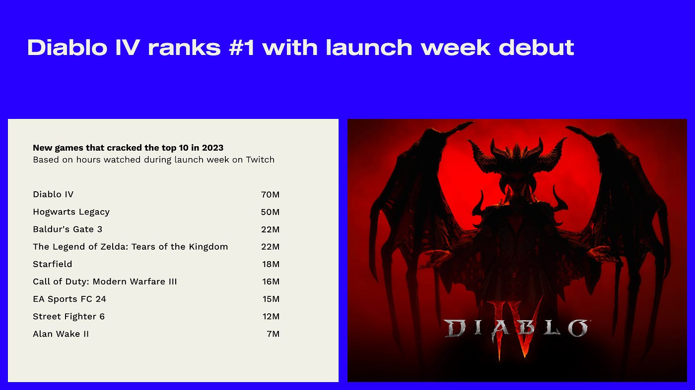Diablo IV had the best start in 2023. In the first week, the game received 70 million hours of views. Following were Hogwarts Legacy (50 million hours) and Baldur’s Gate III (22 million hours). Notably, in 2023, only 9 new games entered the top 10 on Twitch.