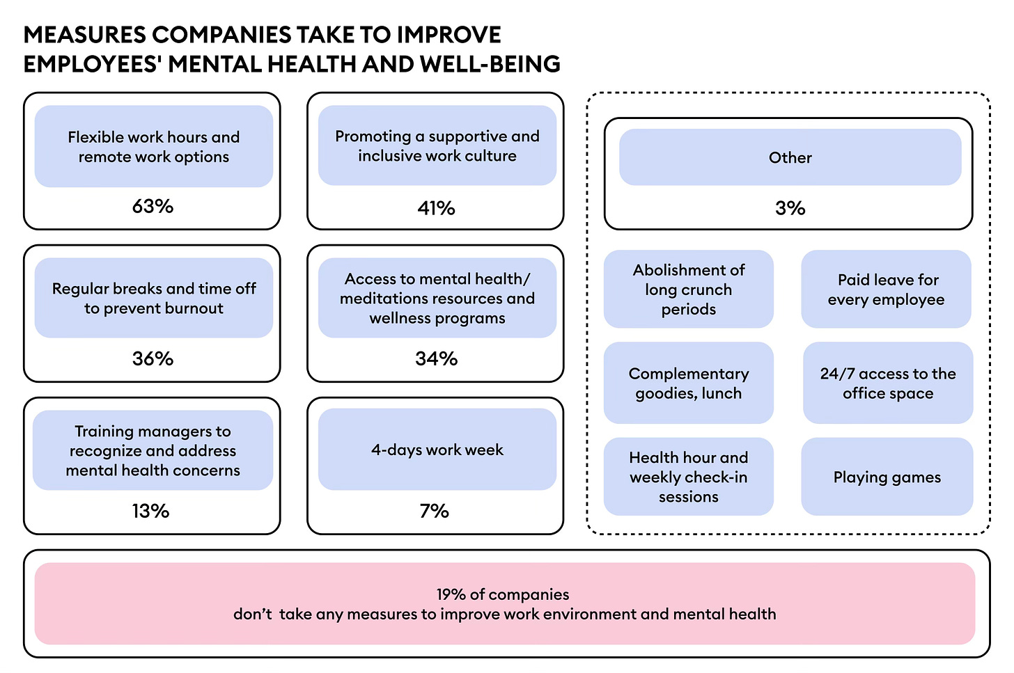 19% of surveyed employees note that companies do nothing to support the mental health of their employees. 52% note that their companies take no action to support inclusivity and equality in the workplace.