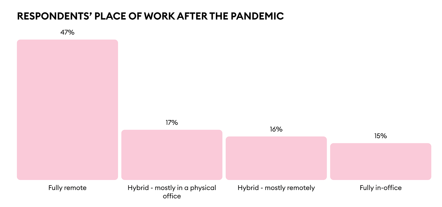 After the end of the pandemic, 47% of respondents continued to work remotely. 33% started working in a hybrid format, and 15% returned to offices. The rest 5% was missed somewhere.