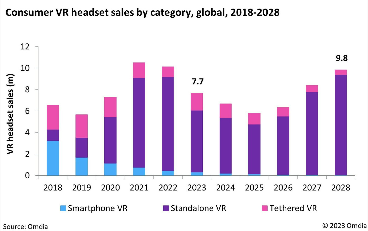 Sales of VR devices in 2023 decreased by 24%—from 10.1 million devices in 2022 to 7.7 million.