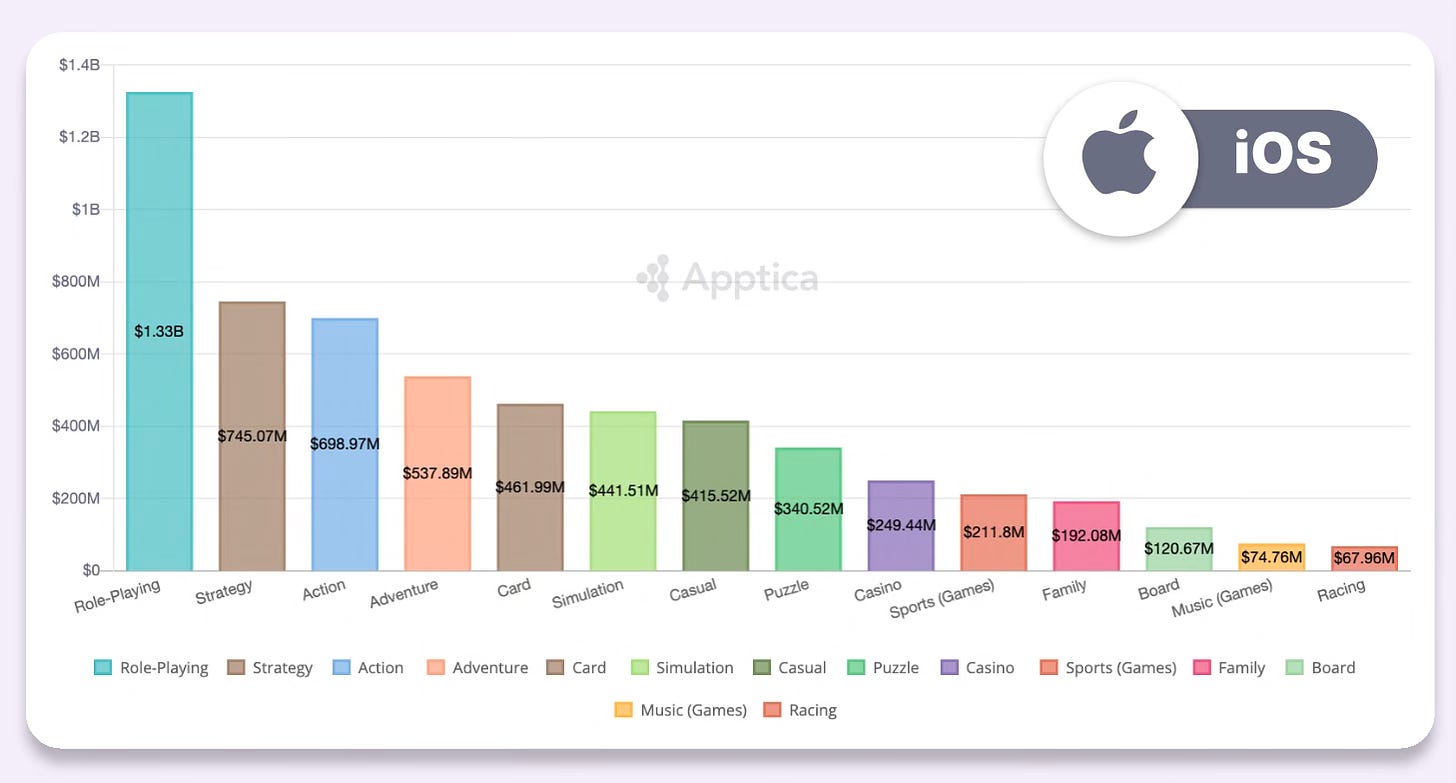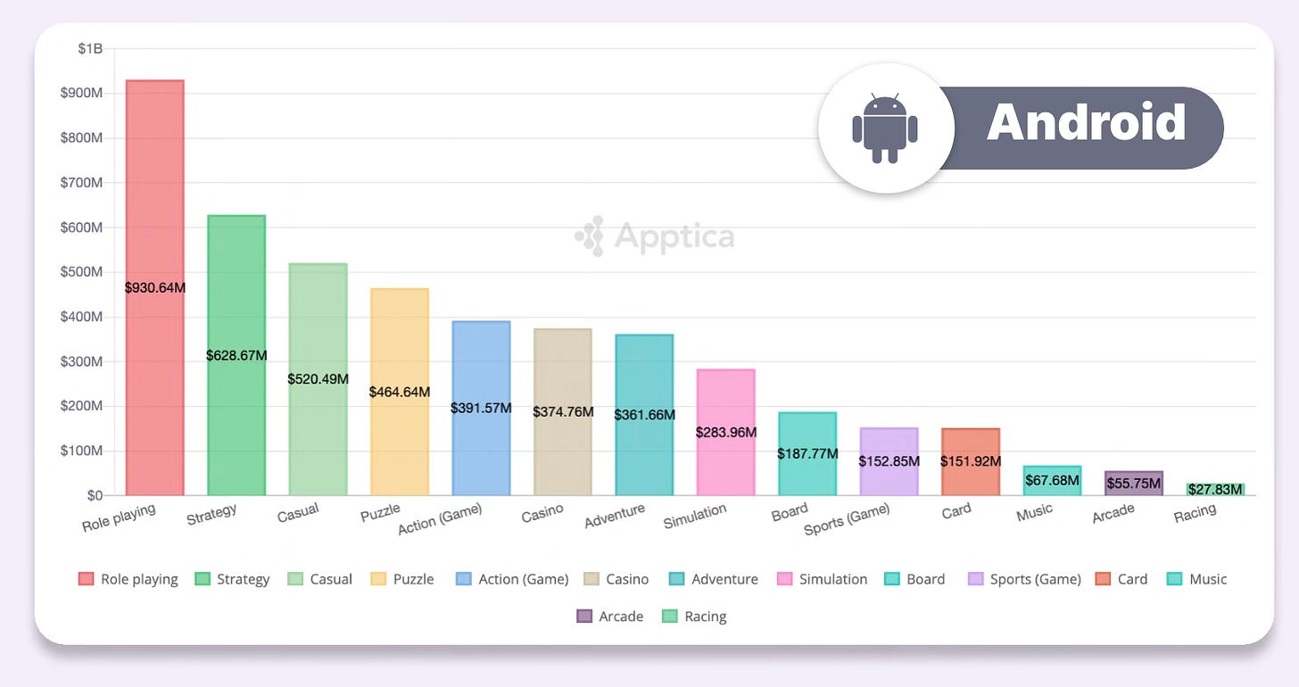 The list includes 3 4X strategies; 2 MMORPGs; 2 battlers; 2 Match-3 games; and 2 slots. 5 games are classified as RPGs by data.ai, but this category includes MOBA, MMORPG, and battlers.