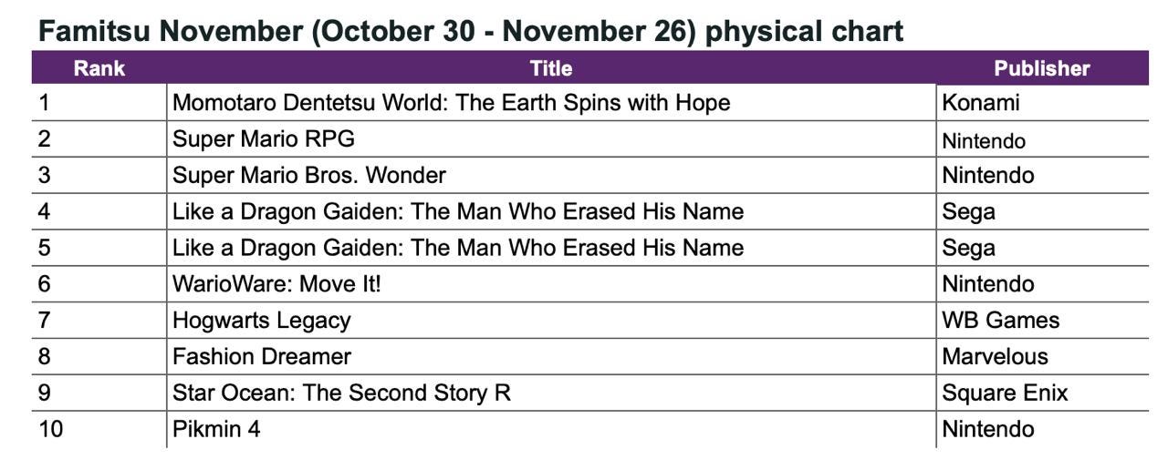 - Famitsu: Momotaro Dentetsu World: The Earth Spins with Hope - the best-selling game in Japan in November