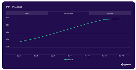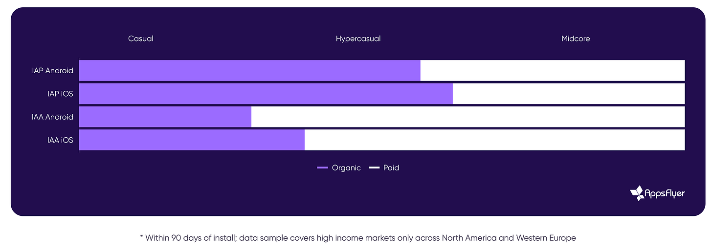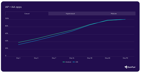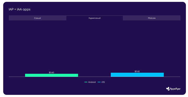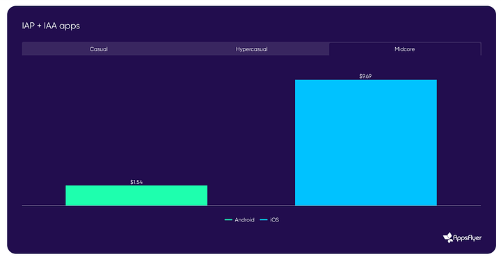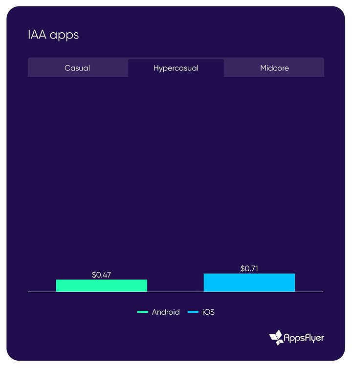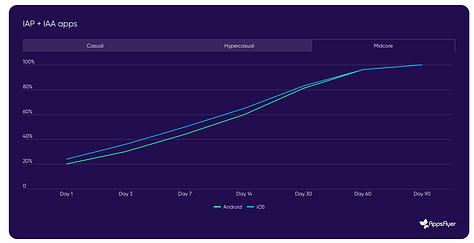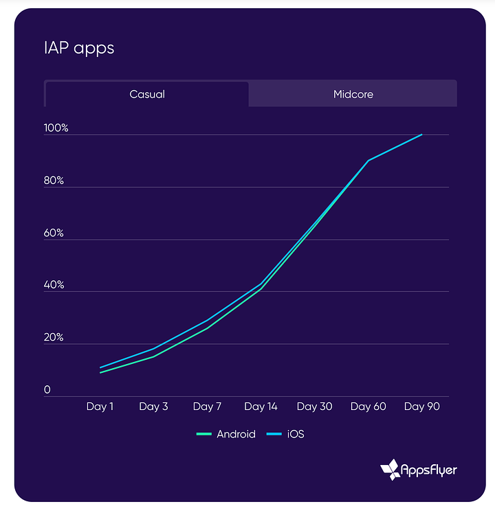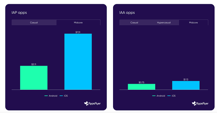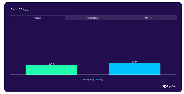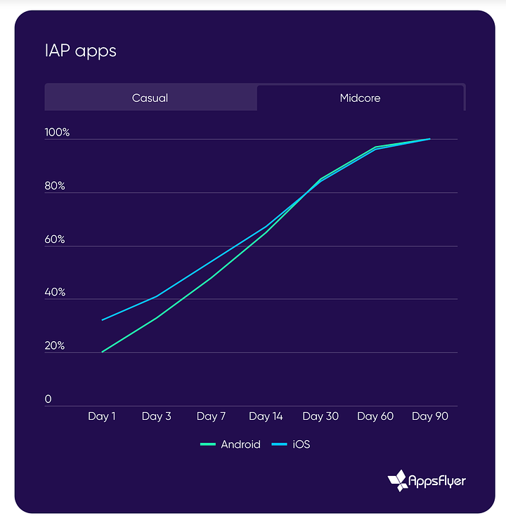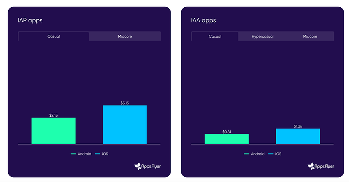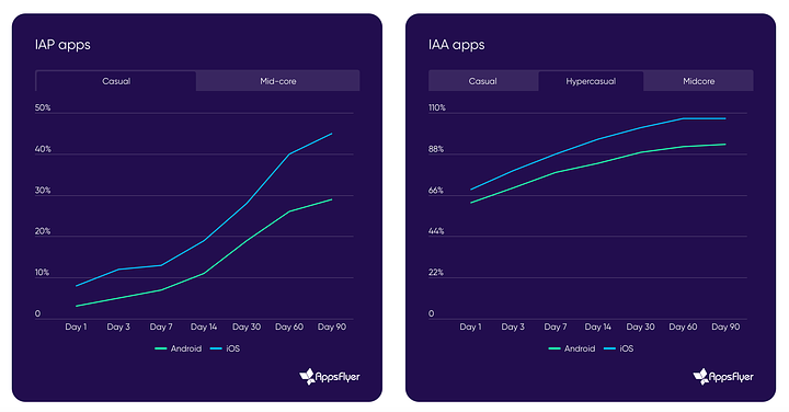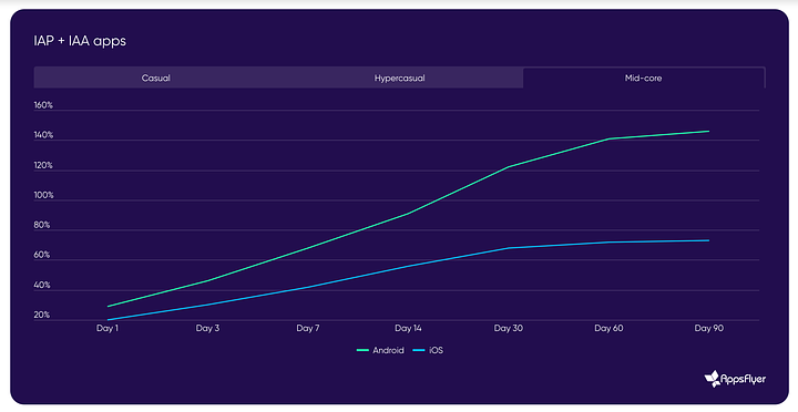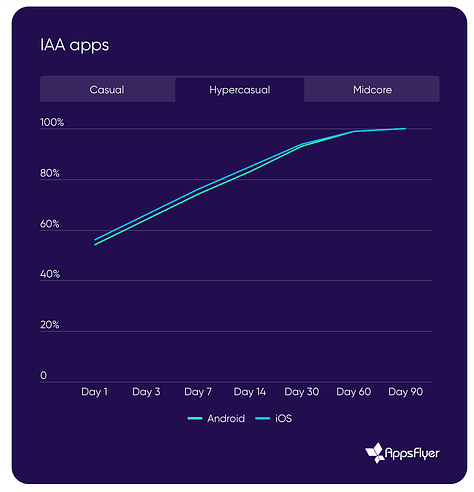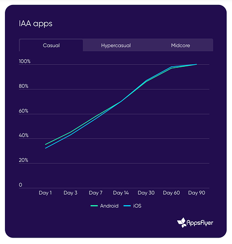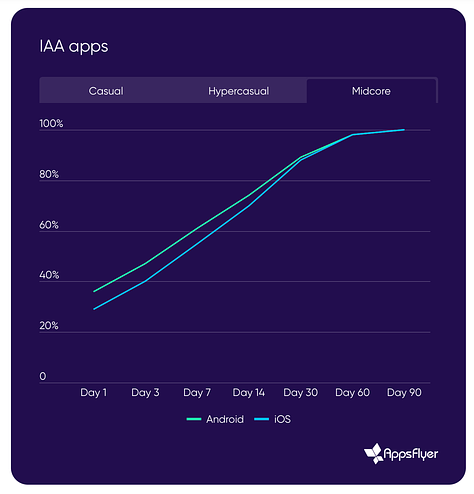 • AppsFlyer shows that casual projects with only IAP monetization achieve 215% D90 ROAS on iOS in T1 Western markets. Or they note that mid-core projects with hybrid monetization demonstrate 122% D30 ROAS on Android.