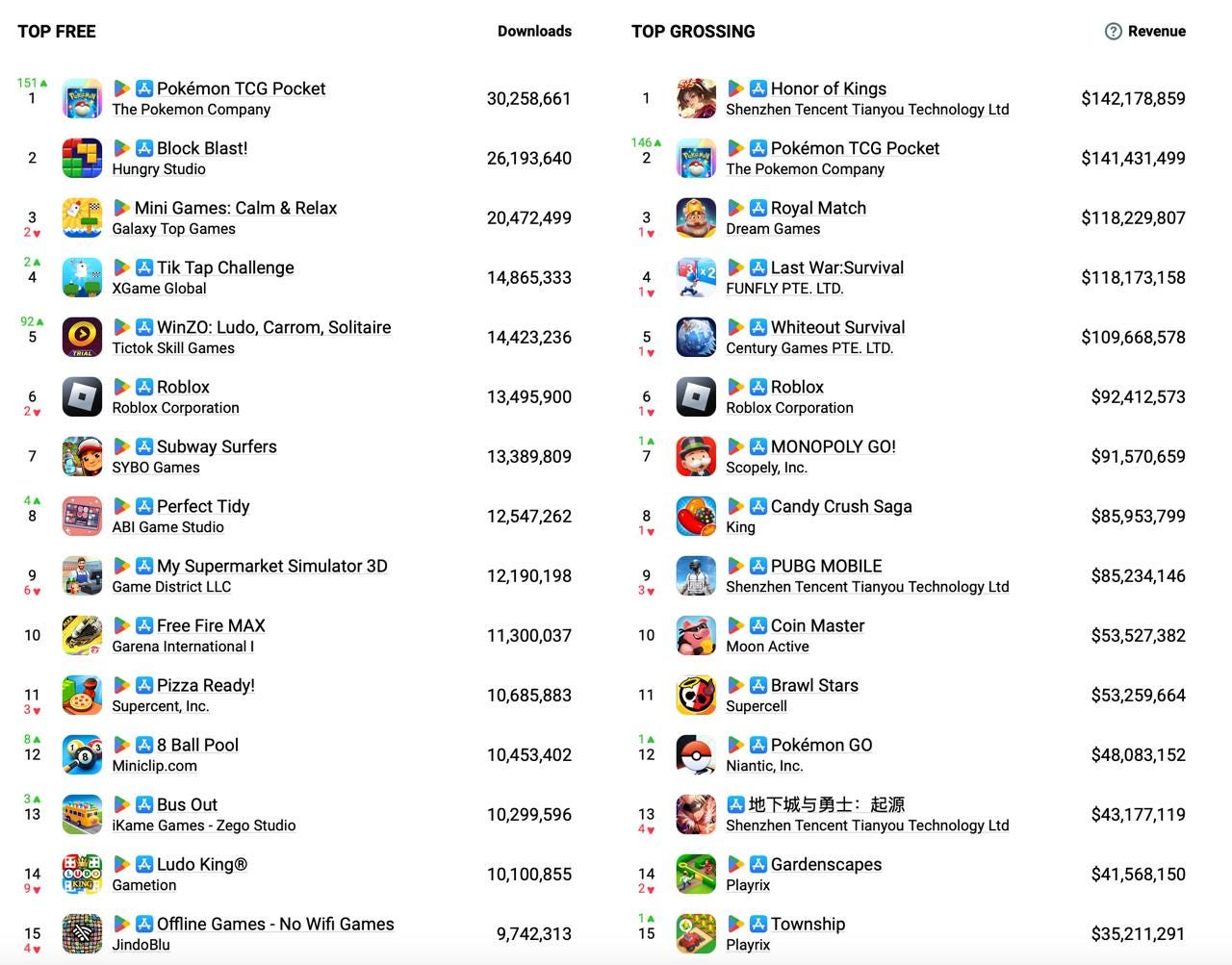 • The main event in the revenue chart is the appearance of Pokemon TCG Pocket. The game earned $141.4 million in the first full month (just short of first place). 42% of the revenue comes from Japan; 27% from the USA. The RPD in Tier-1 Asian countries is $19.42; in Tier-1 Western countries, this figure is significantly lower at $3.79.