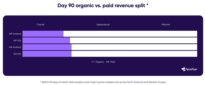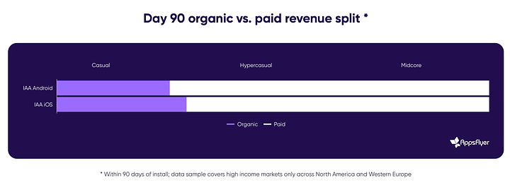 • Purchased users bring 72-76% of all revenue for 90 days in hyper-casual and casual genres - regardless of the type of monetization.