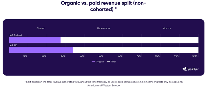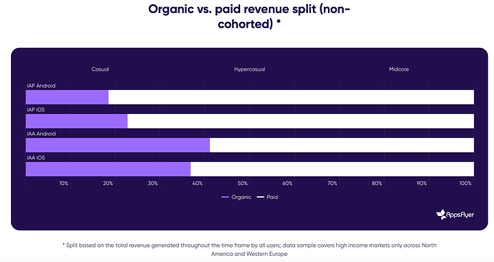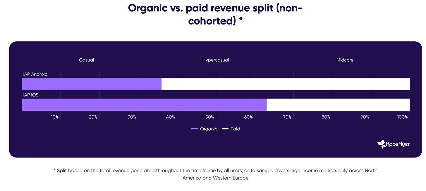 • But in mid-core games on Android, changes are visible. In terms of total revenue (not cohort), the share of purchased users in revenue grows to 64%. On iOS, the same 61% of organic users make the cash.