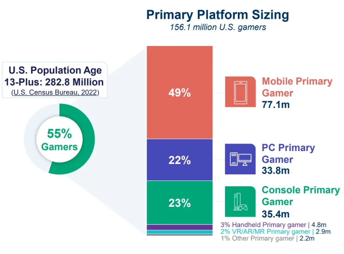 • 49% of the US gaming population named mobile devices as their main gaming platform. Most of this audience are casual older players and women. 23% play mainly on consoles, and 22% on PC. There has emerged a noticeable layer of those who mainly play on portable systems - 3% of such players.