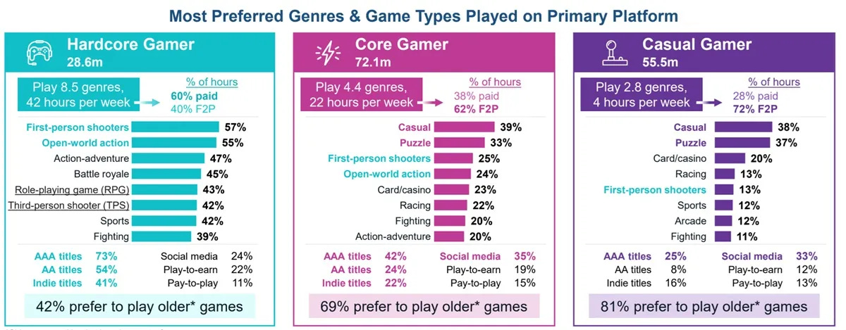 • Interestingly, 69% of "core" gamers and 81% of casual gamers prefer "old" games - those that have been on the market for more than 5 years. People get used to their favorite games and rarely leave them.