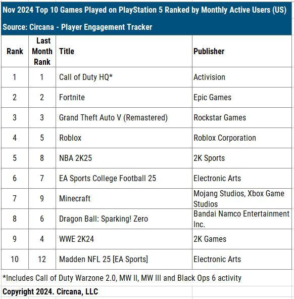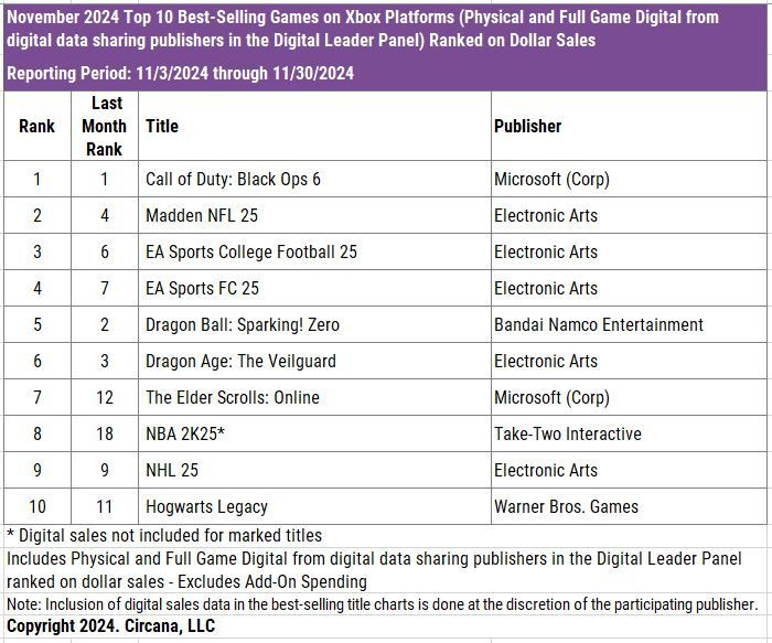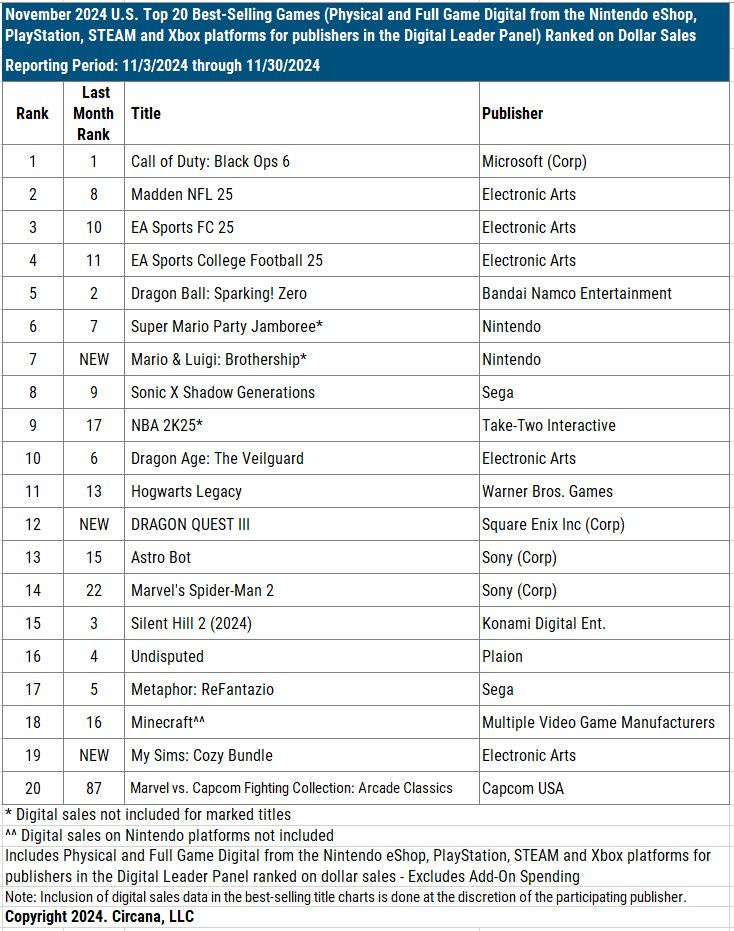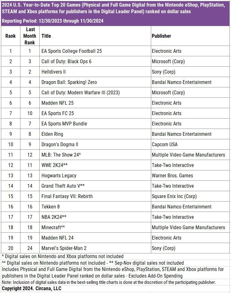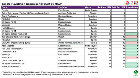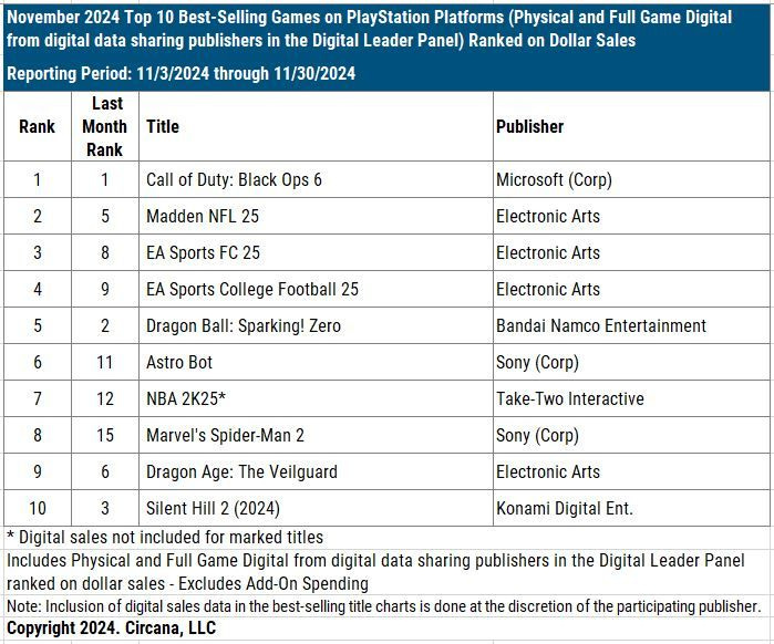 • In the November charts for sales on PlayStation and Xbox, everything is stable - Call of Duty: Black Ops 6, Madden NFL 25, EA Sports FC 25, EA Sports College Football 25 and Dragon Ball: Sparking! Zero are in the first places.