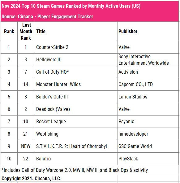 • Counter-Strike 2, Helldivers II and Call of Duty are the leaders in MAU on Steam. Interestingly - Monster Hunter: Wilds is in 4th place; Webfishing is in 8th place and S.T.A.L.K.E.R. 2: Heart of Chornobyl is in 9th place. The game is not available by subscription here, so we can conclude that the project sold well.