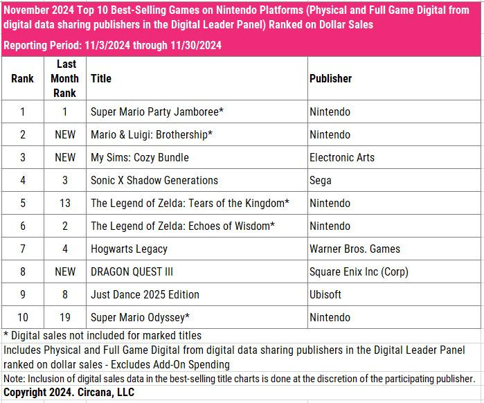 • On Nintendo Switch, there are three new releases in the chart at once - Mario & Luigi: Brothership (2nd place - excluding digital sales), My Sims: Cozy Bundle (3rd place) and Dragon Quest III HD-2D Remake (8th place).