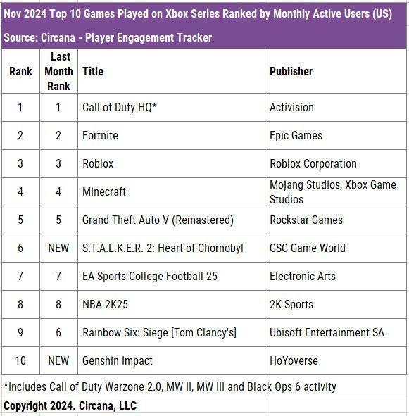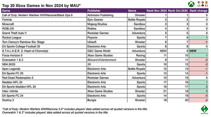 • On Xbox, S.T.A.L.K.E.R. 2: Heart of Chornobyl made it to the 9th place by MAU.