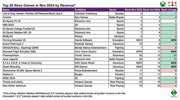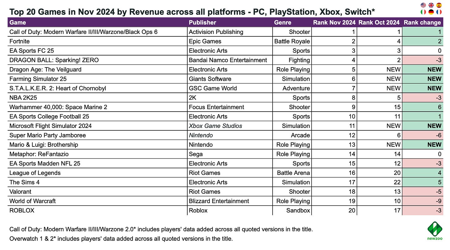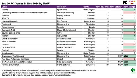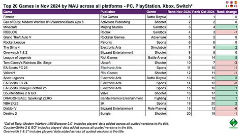 Newzoo: Top 20 PC/console games of November 2024 by Revenue and MAU
