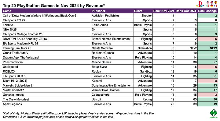 • On PlayStation, only Farming Simulator 25 (8th place) made it to the top.