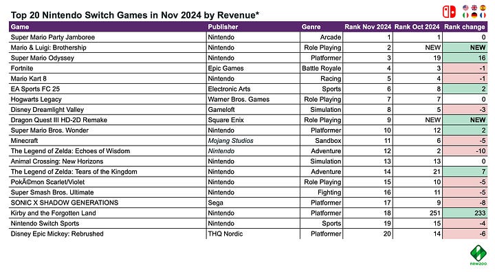• On Nintendo Switch, a couple of new projects are in the chart - Mario & Luigi: Brothership (2nd place) and Dragon Quest III HD-2D Remake (9th position). Also, Kirby and the Forgotten Land (18th place) jumped up 233 positions.