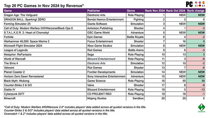 • The November ranking by total revenue includes 5 new releases - Dragon Age: The Veilguard (5th place); Farming Simulator 25 (6th place), S.T.A.L.K.E.R. 2: Heart of Chornobyl (7th position), Microsoft Flight Simulator 2024 (11th place) and Mario & Luigi: Brothership (13th place).