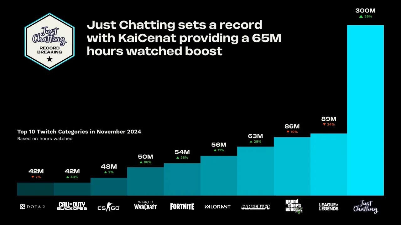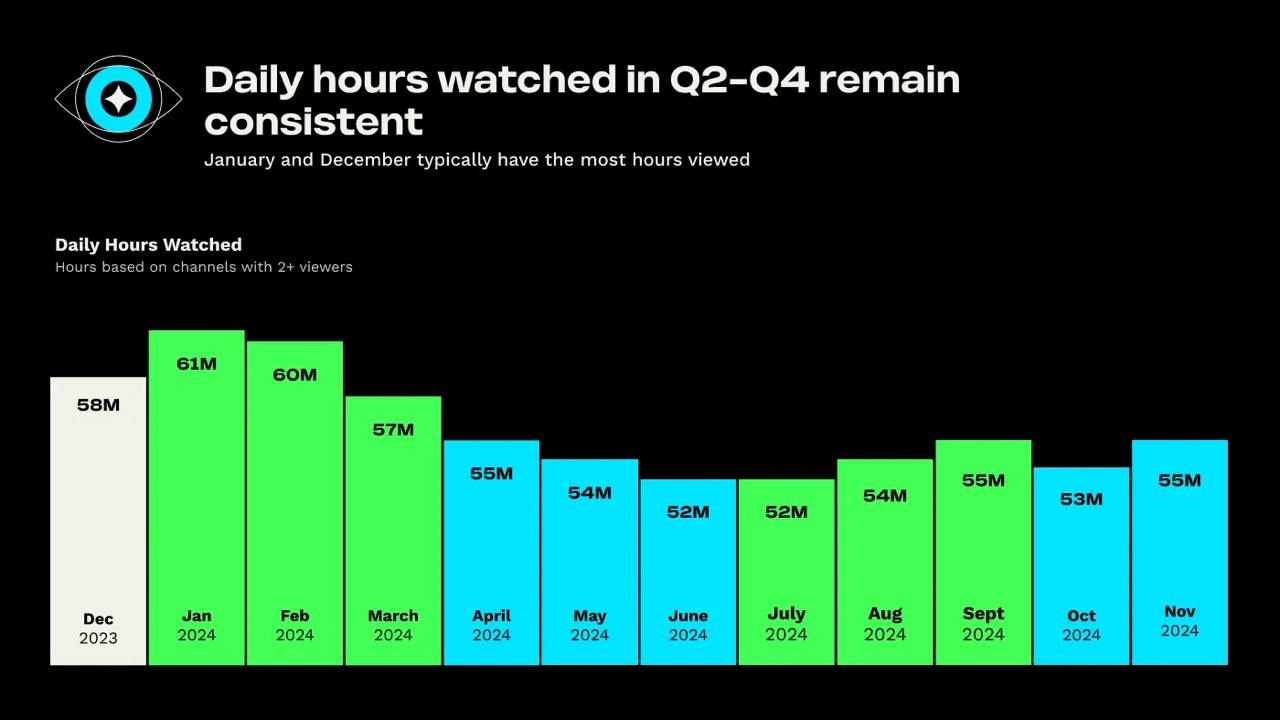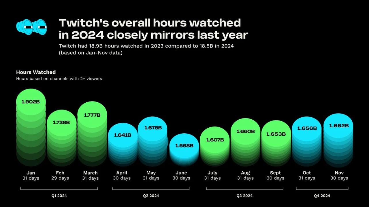 • During the first 11 months of 2024, users spent 18.5 billion hours watching content on Twitch. Last year, for the same period, it was 18.9 billion hours. The lack of growth is explained by competition from other platforms.