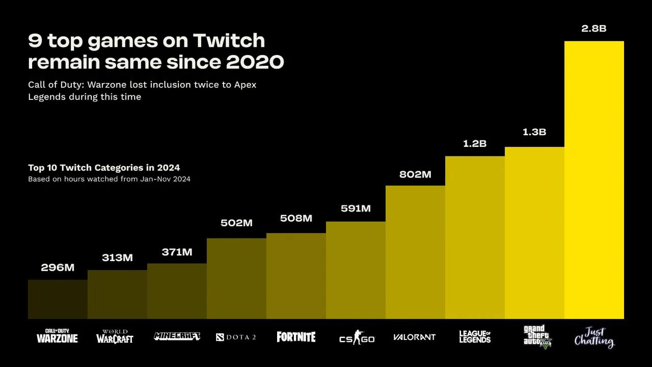 • The top 10 most-viewed categories on Twitch have remained unchanged for 5 years. 9 games have been in this list since 2020. And the most popular category is Just Chatting.
