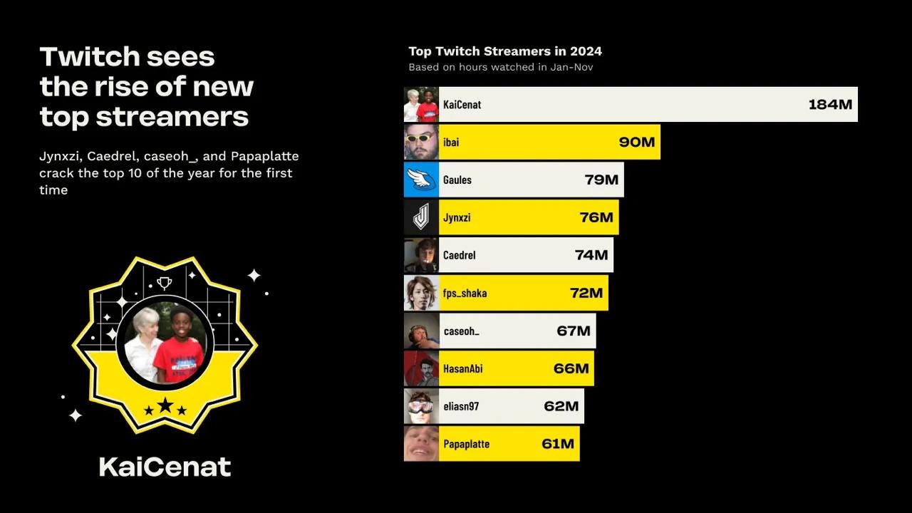 • KaiCenat is the most popular streamer of 2024. From January to November, he was watched for 184 million hours. The closest follower, ibai, has 90 million hours.