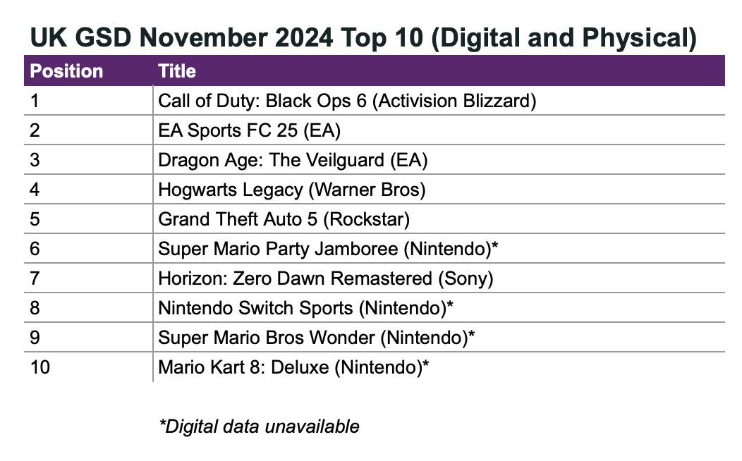 • Over 3 million games were sold in the UK in November this year. This figure is 33% lower than last year’s indicators. This is due to two factors: the release of CoD: Black Ops 6 in October 2024; and the absence of Black Friday (analysts will attribute the sale to December).