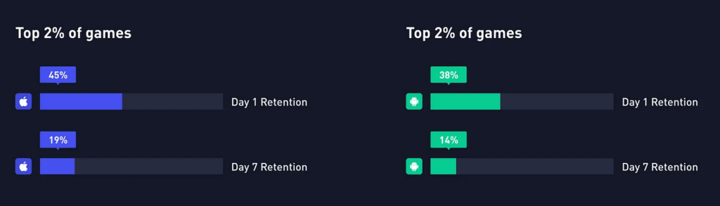 - Among the top-25% of games, an average D1 Retention on iOS was 33%; on Android - 28%. D7 Retention on iOS - 10%; on Android - 6%.