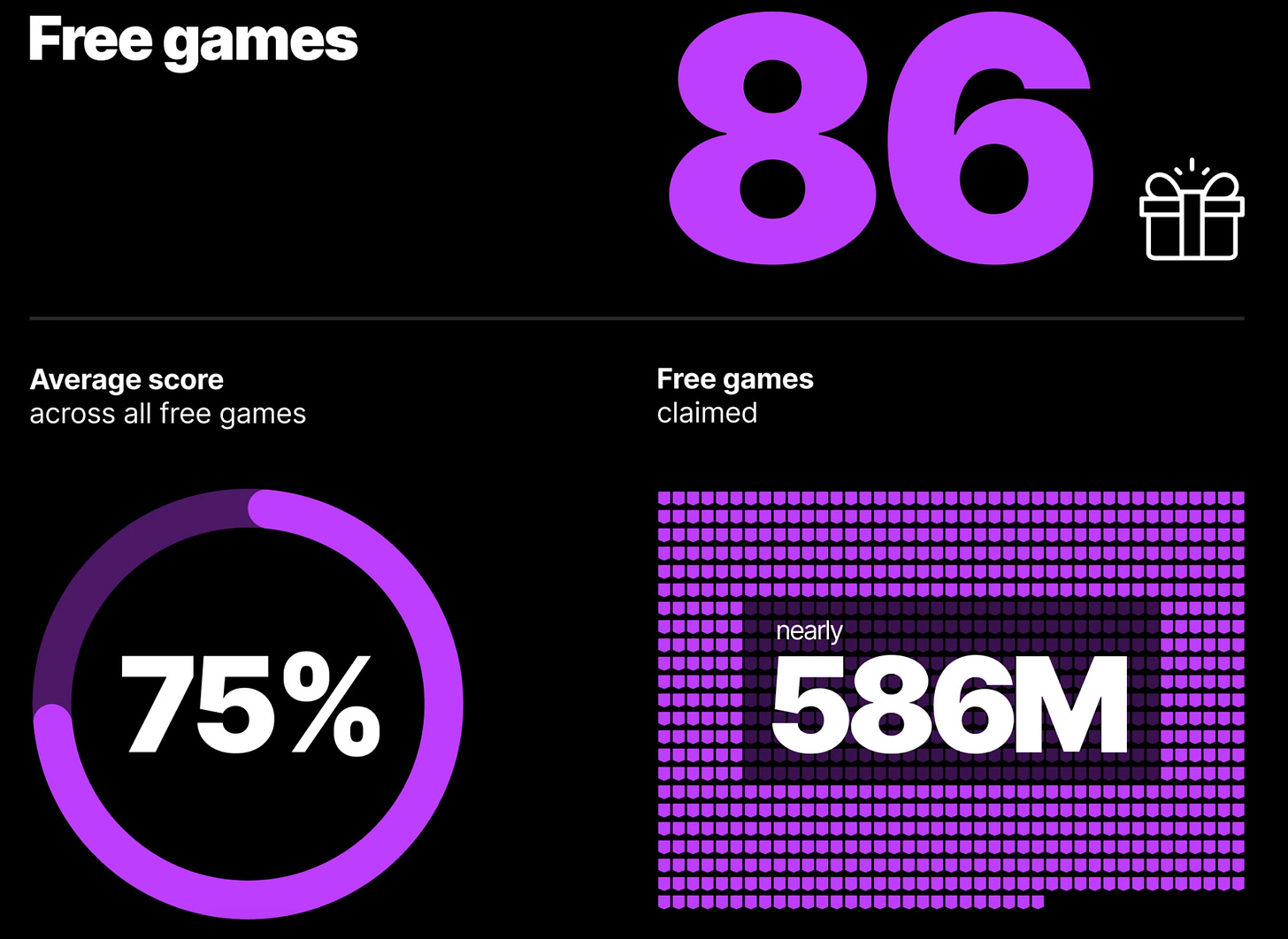 The company gave away 86 games in 2023 through the Free Games program. Their total retail value was $2055 with an average Metacritic score of 75. In 2023, users claimed 586 million copies of free games.