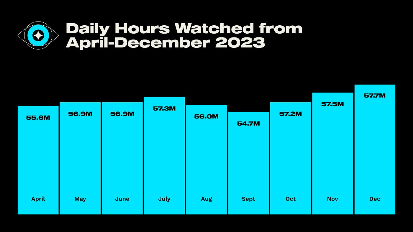 The average daily hours on Twitch in December reached 57.7 million hours, marking the highest figure since April 2023.