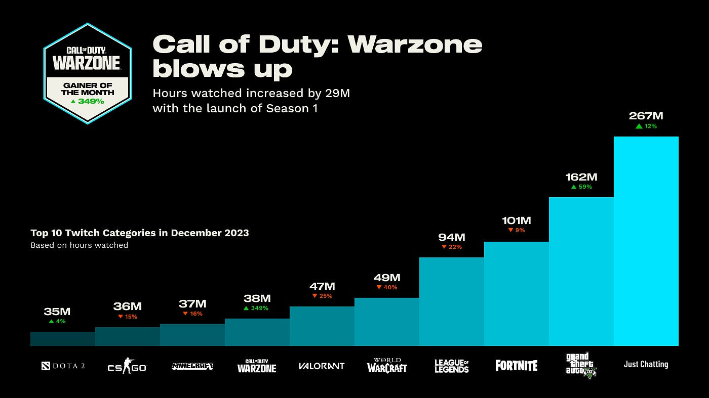 Call of Duty: Warzone experienced significant growth - a 349% increase, thanks to the release of Season 1. The game garnered 38 million hours of views in December.