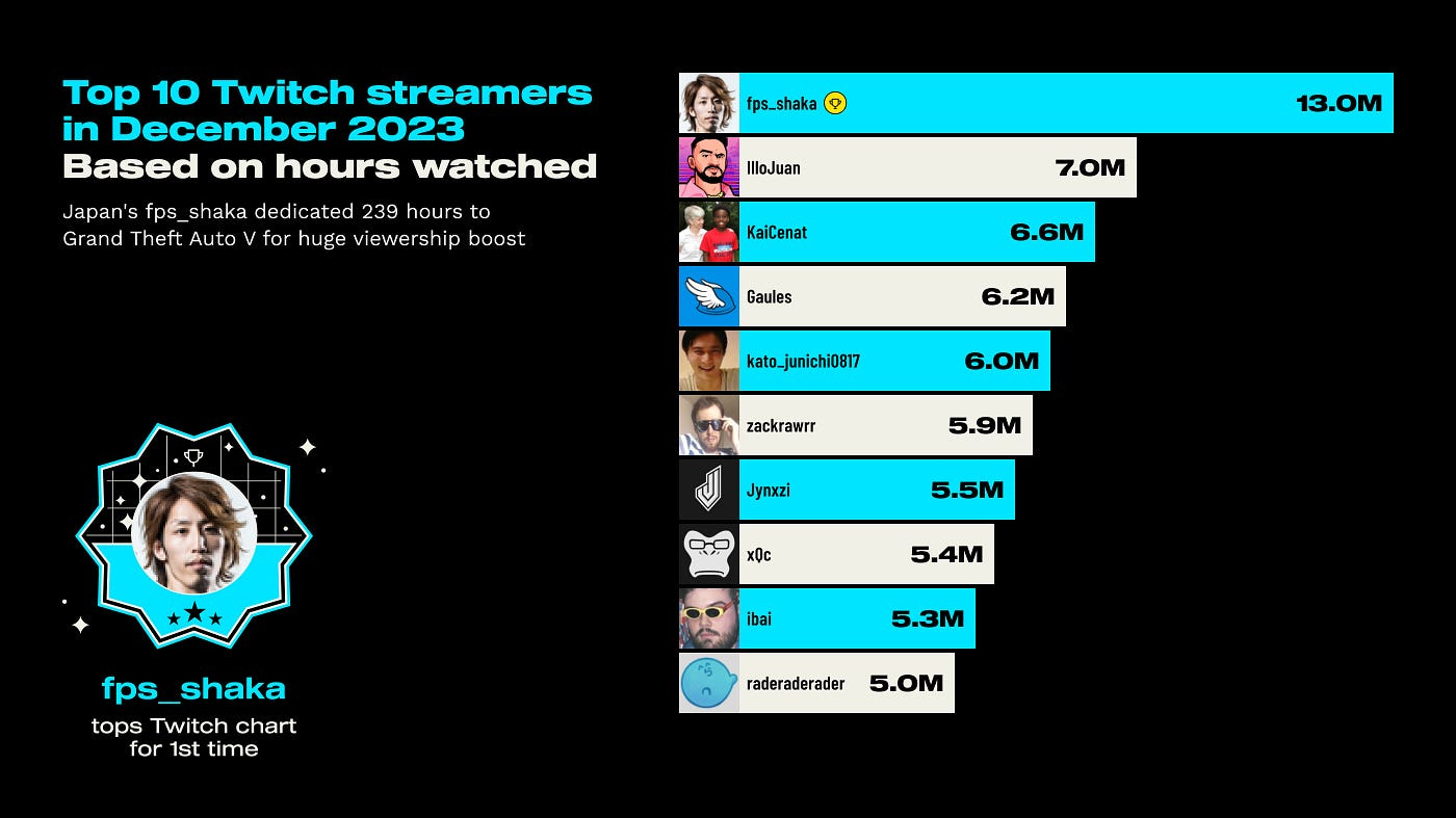 fps_shaka - the top streamer in December on Twitch. The Japanese-speaking streamer has never claimed the top spot before. He streamed Grand Theft Auto V the most, totaling 239 hours.