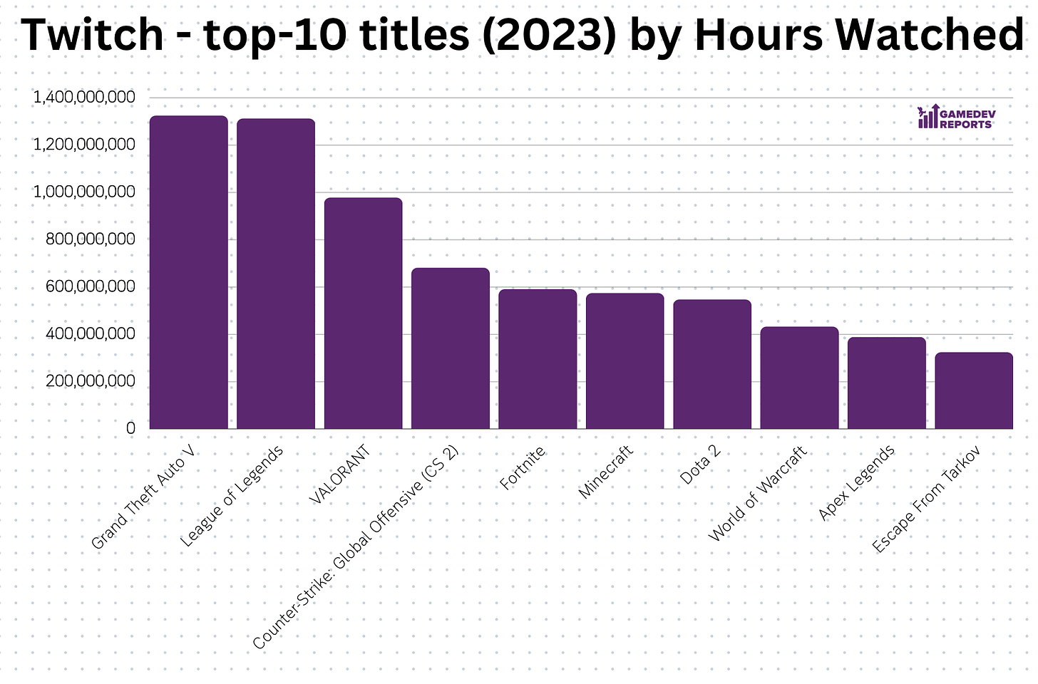 Grand Theft Auto V (162 million hours, +59% MoM), Fortnite (101 million hours, -9% MoM), and League of Legends (94 million hours, -22% MoM) were the leaders on Twitch in December 2023.