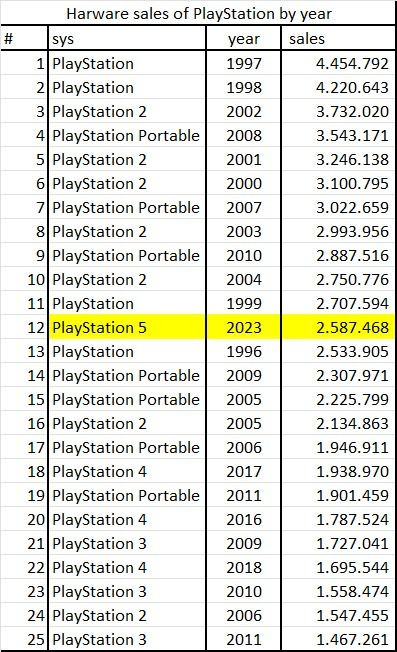 2023 ranks as the 12th most successful year for PlayStation systems (out of 25). Sony's major success occurred in 1997 when the first PlayStation was sold 4.45 million times.