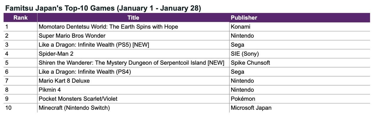 - Famitsu: Like a Dragon: Infinite Wealth became the best-selling game of the month in Japan in January