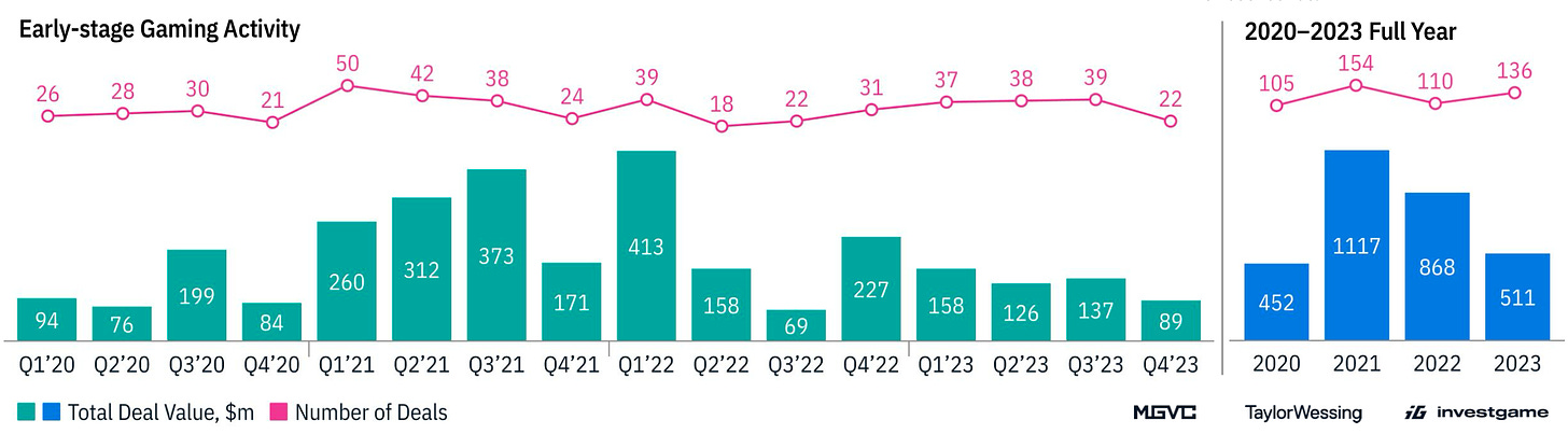 Speaking specifically about developers and publishers, in 2023, there were 136 deals (+23.6% compared to 2022) in the early stages totaling $511 million (-70% compared to 2022).